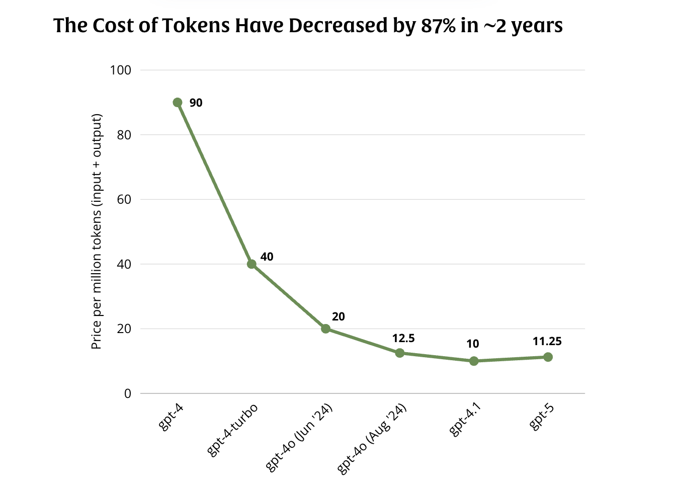 In isolation, if you asked the average founder or VC whether token prices for LLMs at a consistent level of intelligence will go up or down over the next five years, they’d universally say prices will go down. We’ve been seeing this play out since the launch of GPT-3, with token costs dropping 80%+ over the past two years.