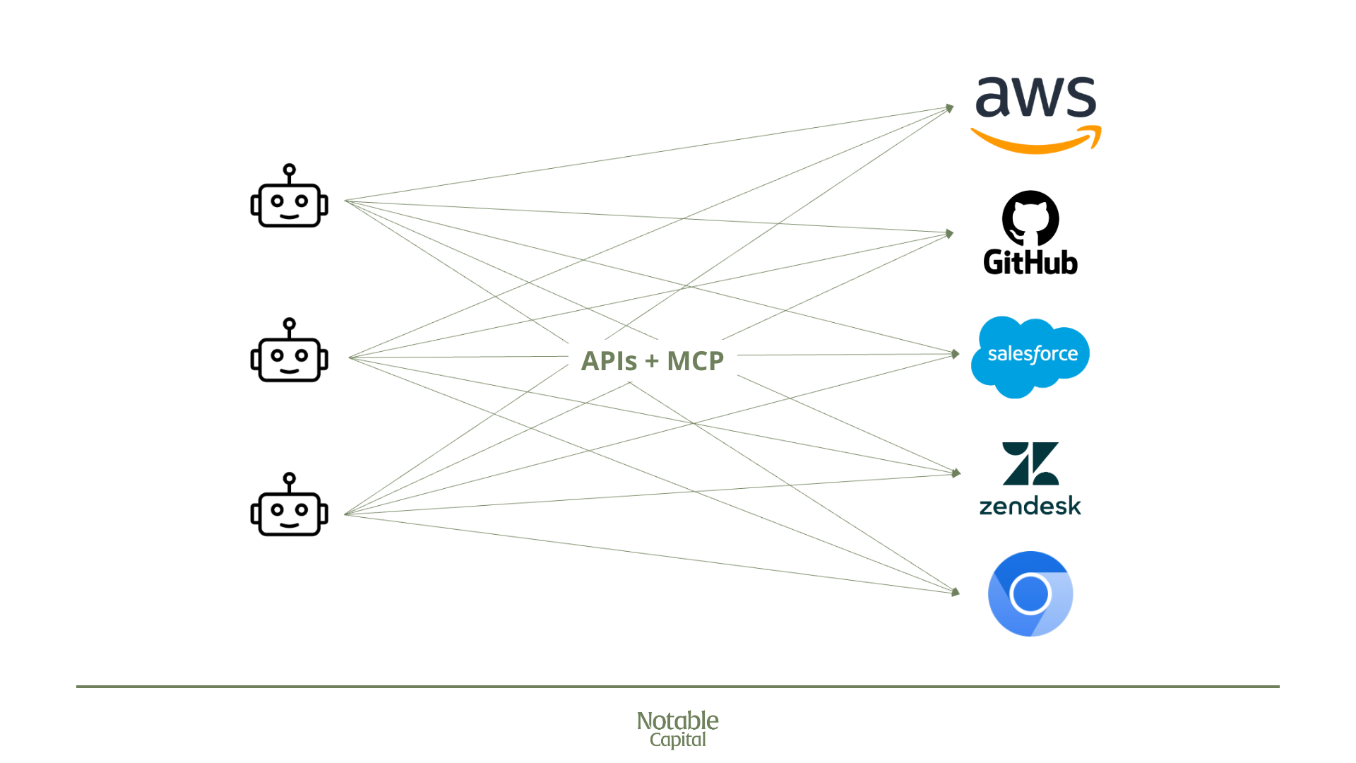 Finally, MCPs continue to gain mindshare as a standardized way for agents to interface with web or SaaS tools. However, many MCPs are being deployed without baseline authentication and authorization requirements. The Anthropic* team recommends implementing OAuth 2.1, but OAuth alone leaves much to be desired, namely fine-grained access control. This gets unruly quickly–hundreds of agents need to connect to dozens of services, the classic NxM problem (visualized below) creating a need for providers like Descope* to enable developers to implement proper auth for MCPs quickly.