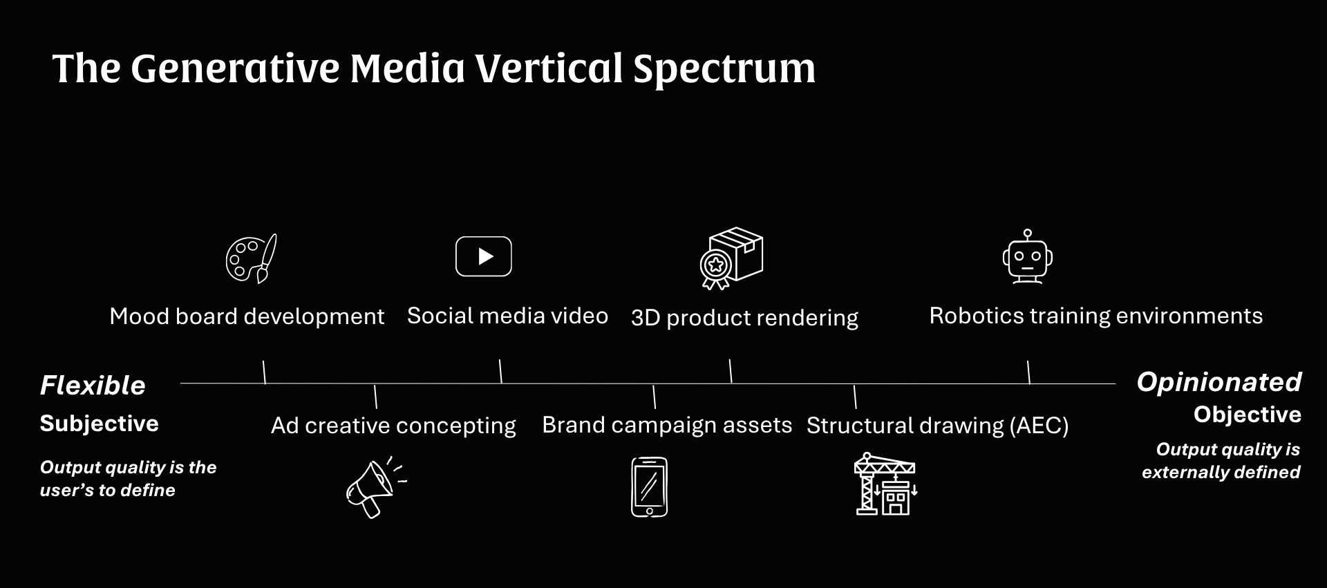 Different output types carry different requirements, which is why I argue a useful definition for verticalization in generative media is output type, not industry.